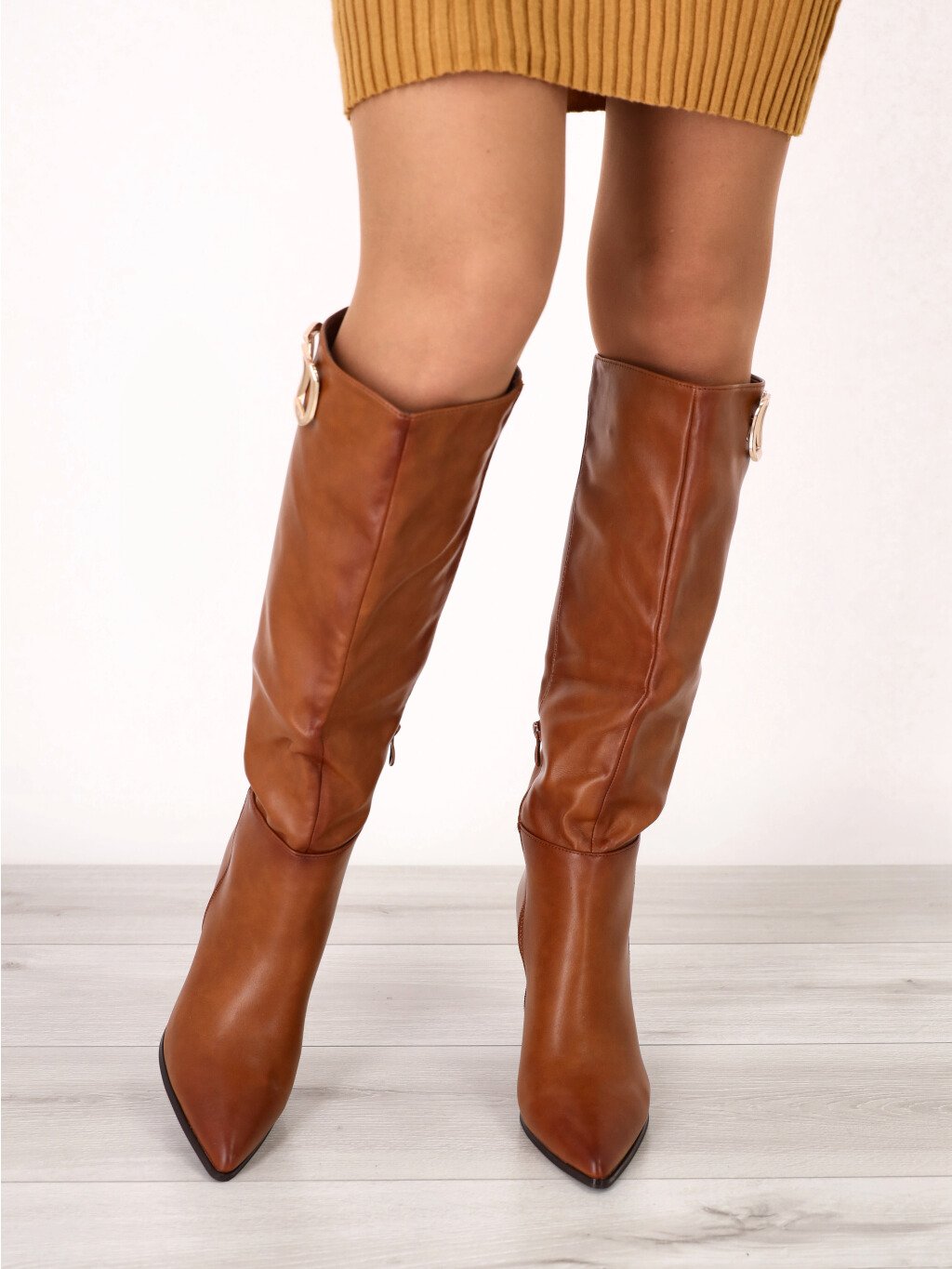 Dámske vysoké čižmy pod kolená na vysokom stabilnom podpätku. Elegantné čižmy v škoricovej farbe s módnou špicatou špicou, na opätku. Druh dámskych topánok, ktoré sú módne a stále. Zapínanie na zips. Zateplená dámska obuv vhodná na jeseň a zimu. Tento typ obuvi odporúčame vhodne impregnovať podľa druhu materiálu, z ktorého sú topánky vyrobené. Celková výška topánky je 50 cm a sú vhodne kombinovateľné ku každému druhu oblečenia. Módne a trendové škoricové čižmy. Čižmy sú doplnené zlatou aplikáciou.