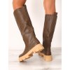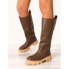 Dámske zeleno hnedé čižmy na mohutnej podrážke. Čižmy sú celokožené (eko koža). Obuv je zateplená jemnou kožušinou a vhodná do zimného počasia. Čižmy sa zapínajú na zips a ich výška siaha tesne pod kolená. Charakter pevnej vysokej podrážky ich predurčuje k športovým outfitom.