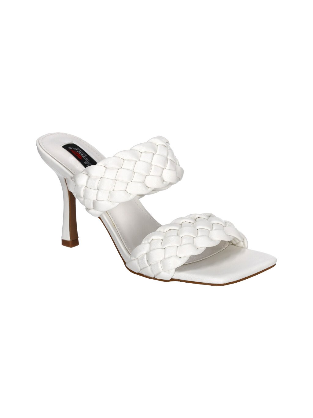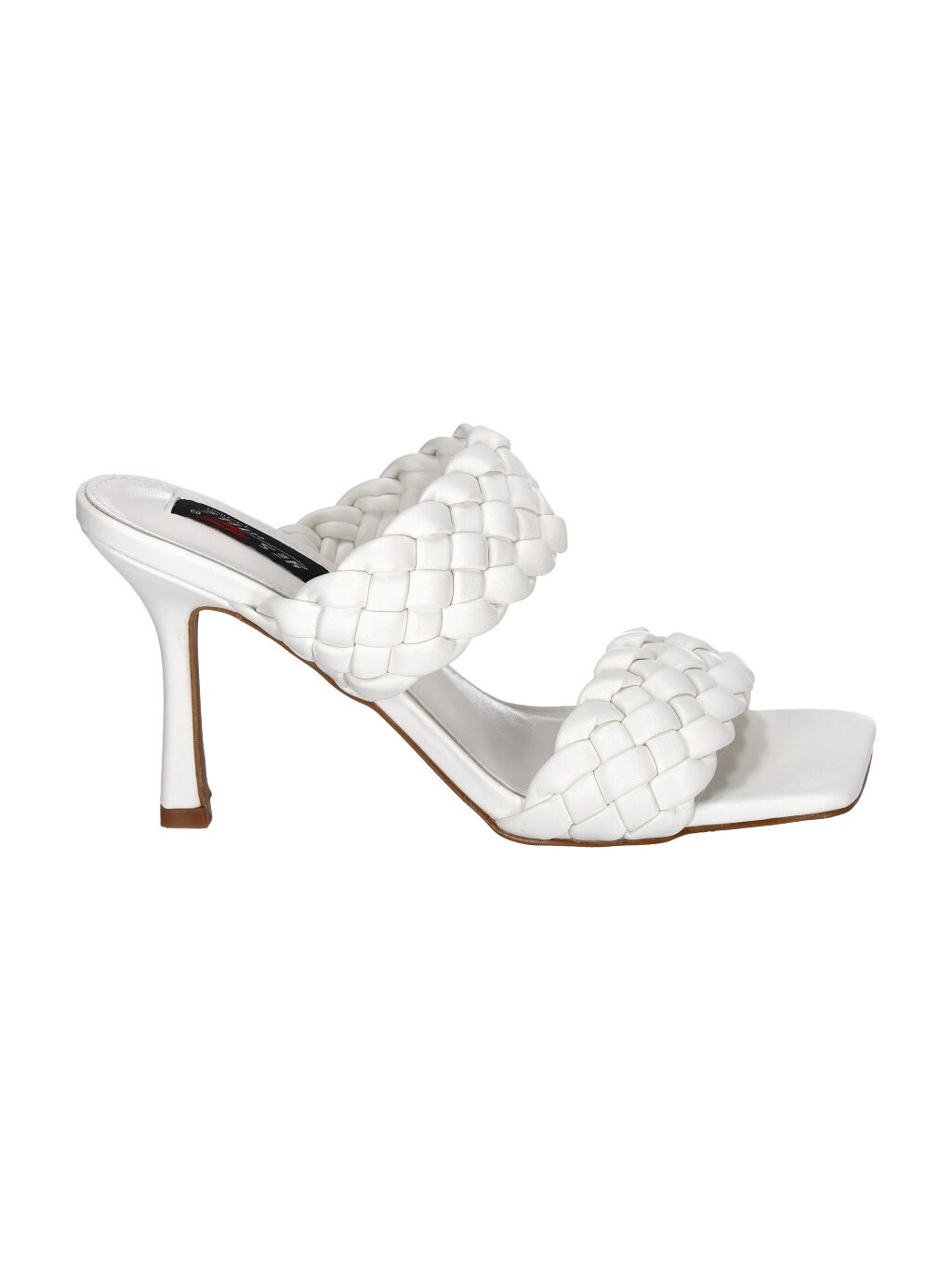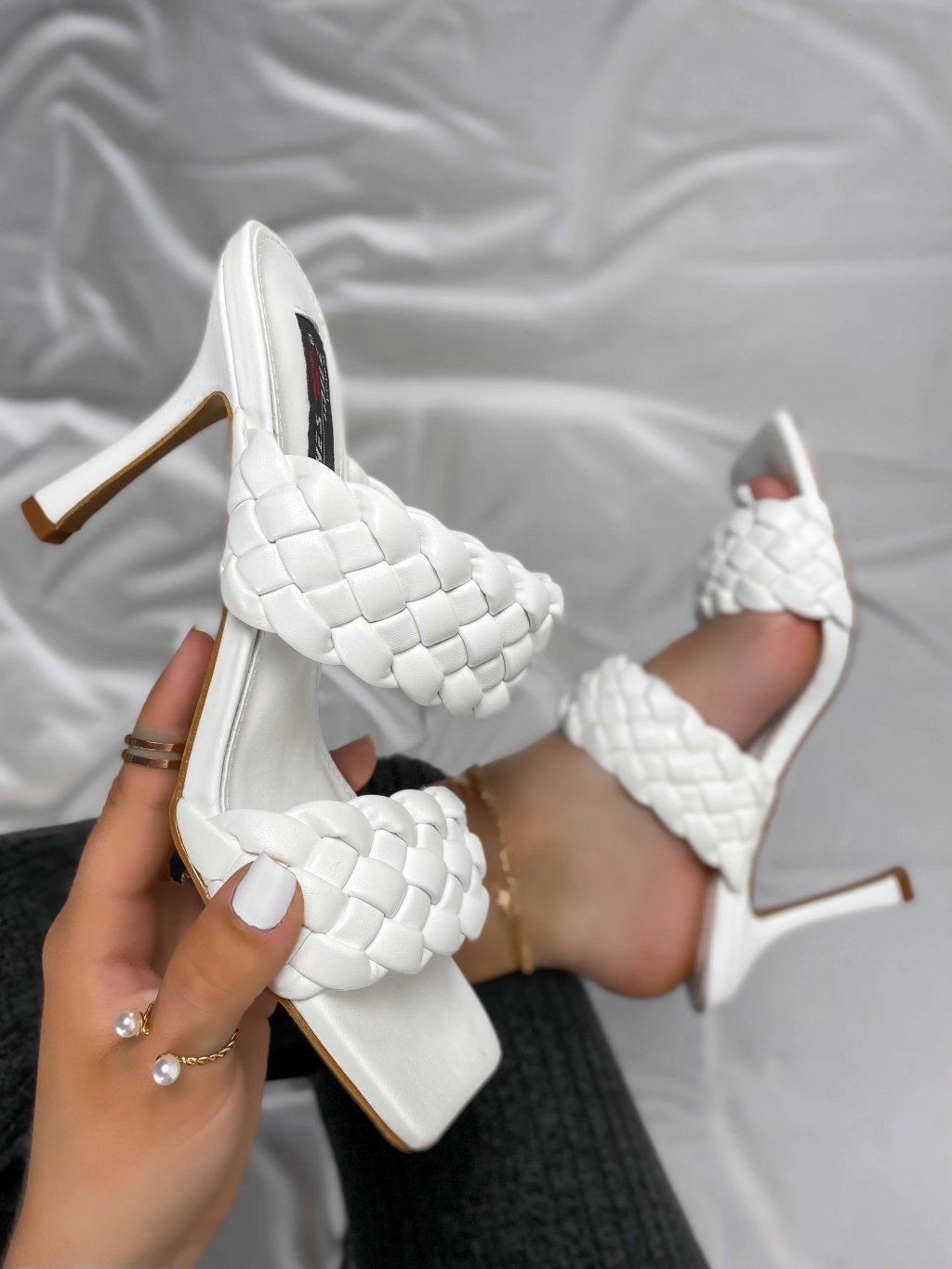 Vysoký podpätok s prepletanými remienkami vyšperkovaný žiarivou farbou.