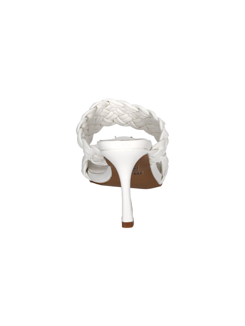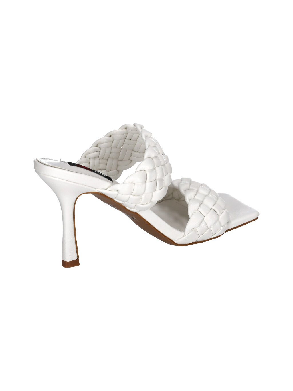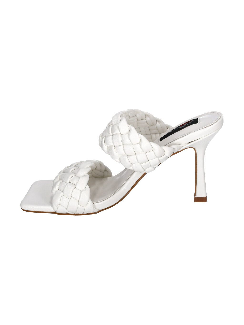 Vysoký podpätok s prepletanými remienkami vyšperkovaný žiarivou farbou.