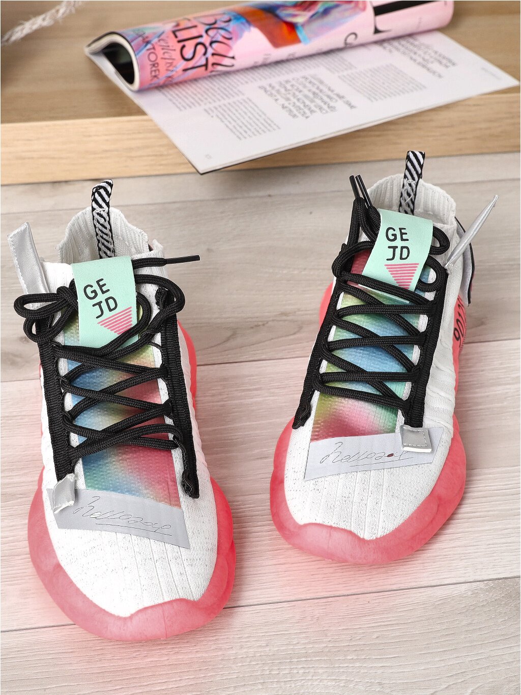 Látkové elestické biele tenisky na šnúrky, s farebnou podrážkou. Ozdobné nápisy a použité módne aplikácie zmenia i jednoduché oblečenie na trendový outfit.