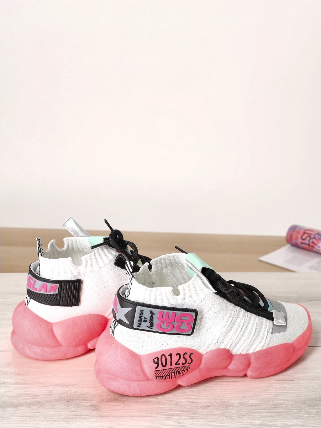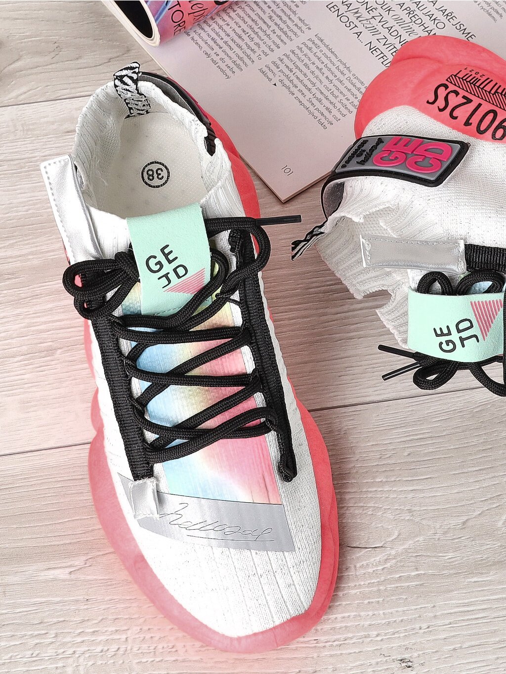 Biele tenisky s ružovou podrážkou a farebnými doplnkami.