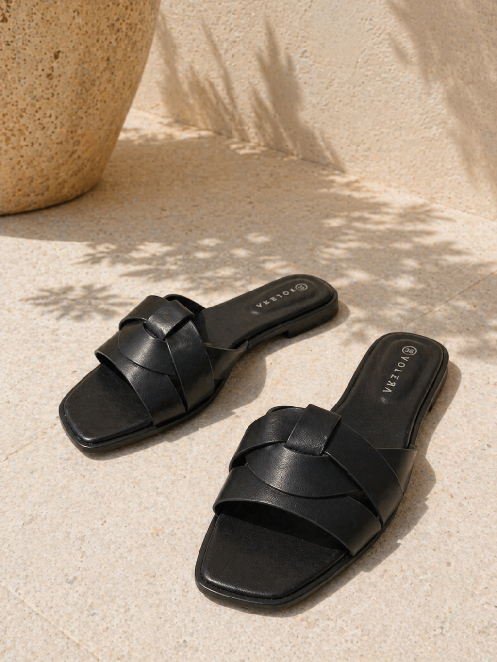 Jednoduché čierne šľapky s prepletaným vzhľadom. Nízka podrážka a univerzálny dizajn zabezpečia, že po nich siahnete takmer každý deň.