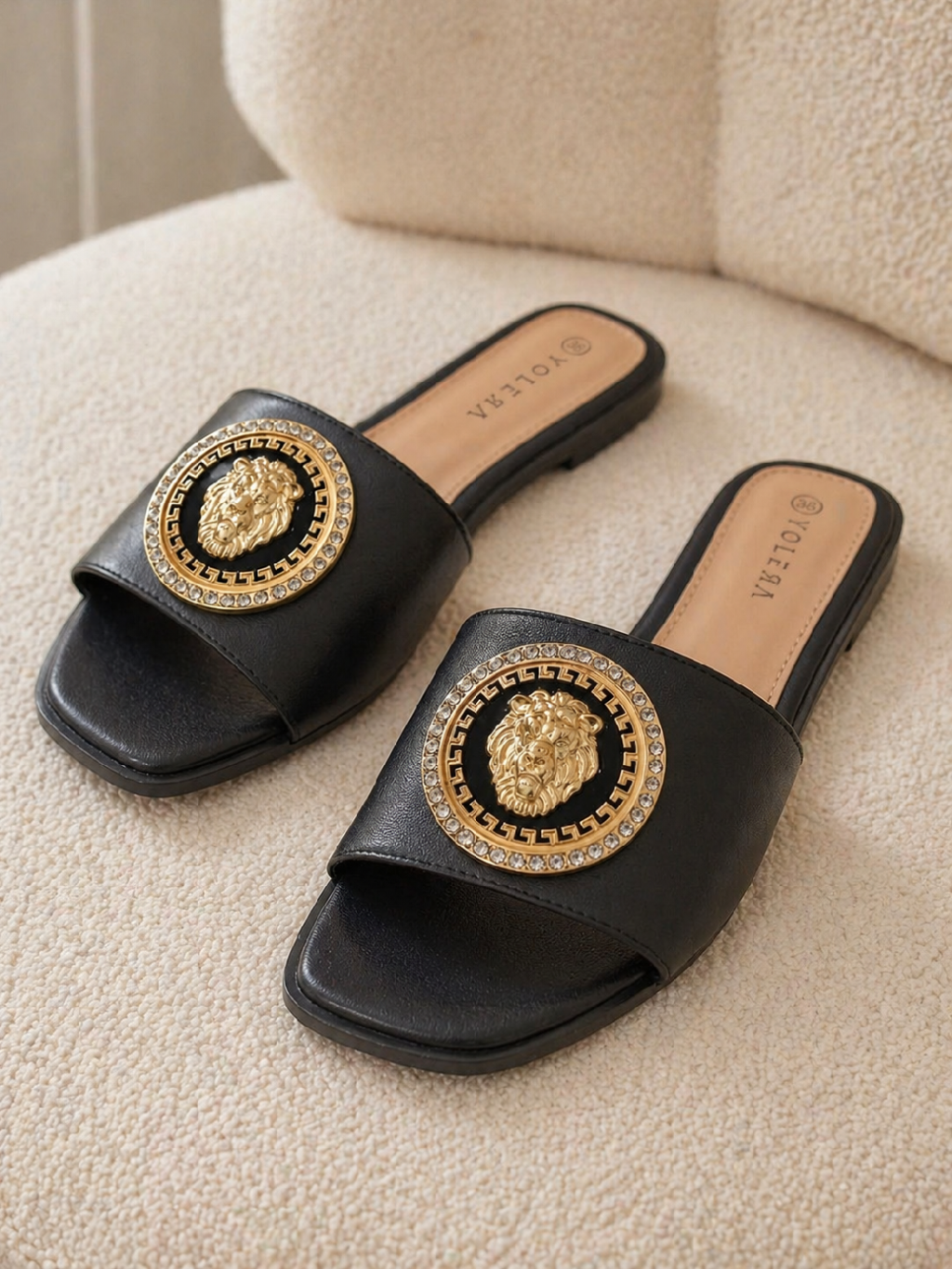 ŠTÝLOVÝ DIZAJN: Výrazný zlatý doplnok na zvršku dodáva šľapkám luxusný a neprehliadnuteľný vzhľad. Čierne prevedenie v kombinácii s ozdobným detailom pôsobí elegantne a zároveň moderne.
