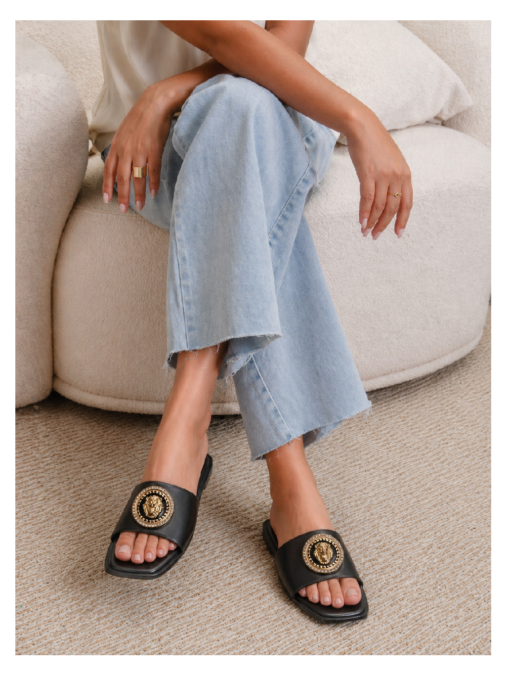 Čierne šľapky s výraznou zlatou ozdobou pôsobia luxusne, štýlovo a okamžite pritiahnu pozornosť. Skvele ich zladíte s džínsami, ľanovými nohavicami alebo jednoduchými šatami.
