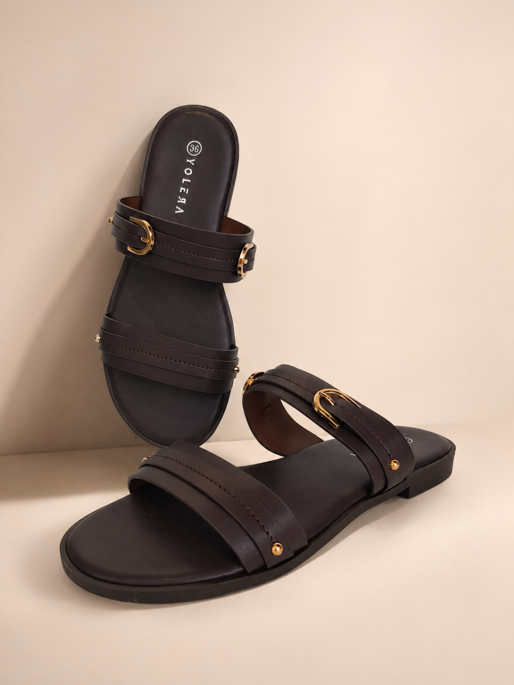 Hnedé dámske šľapky so zlatými doplnkami. Skombinujete ich so šatami, elegantnými nohavicami aj riflami.
